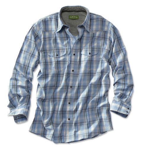 True western style with remarkable attention to detail sets this plaid shirt apart. Chambray accents, faux-tortoise snaps, and taped interior collar band. Western-style fit—cut trimmer than our standard shirt fit. Men's plaid western shirt in blue. Pure cotton. Washable. Imported. Sizes: S(34-36), M(38-40), L(42-44), XL(46-48), XXL(50-52).