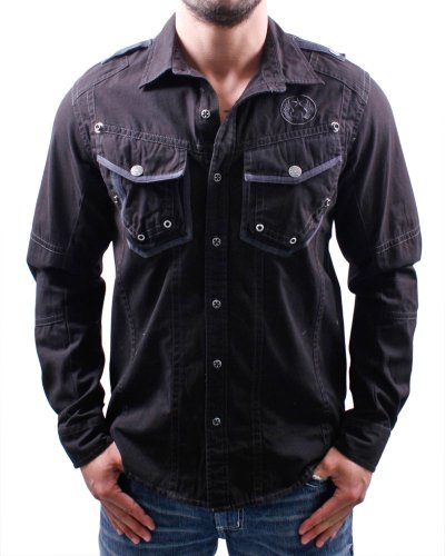 Affliction Clothing's ability to set the bar high in fashion is evident in its collection's indulgence of style and design, focus on quality, and its trademark series of divinely executed, dark and powerful themes. Affliction is a mainstay for the most elite athletes, heaviest bands, A-listers and the fashion conscious worldwide. This Overtake long sleeve woven features all western inspired military style with contrast stitching, front button lapel pockets with canvas details, Affliction patch on left, and epaulette straps on shoulders. 100% Cotton. Measurements: S - Chest 40", Length 28", Sleeve 25.5", M - Chest 42", Length 30", Sleeve 26", L - Chest 44", Length 30", Sleeve 26", XL - Chest 46", Length 31", Sleeve 26.5", 2XL - Chest 48", Length 31.5", Sleeve 26.5". Style: 10WV445